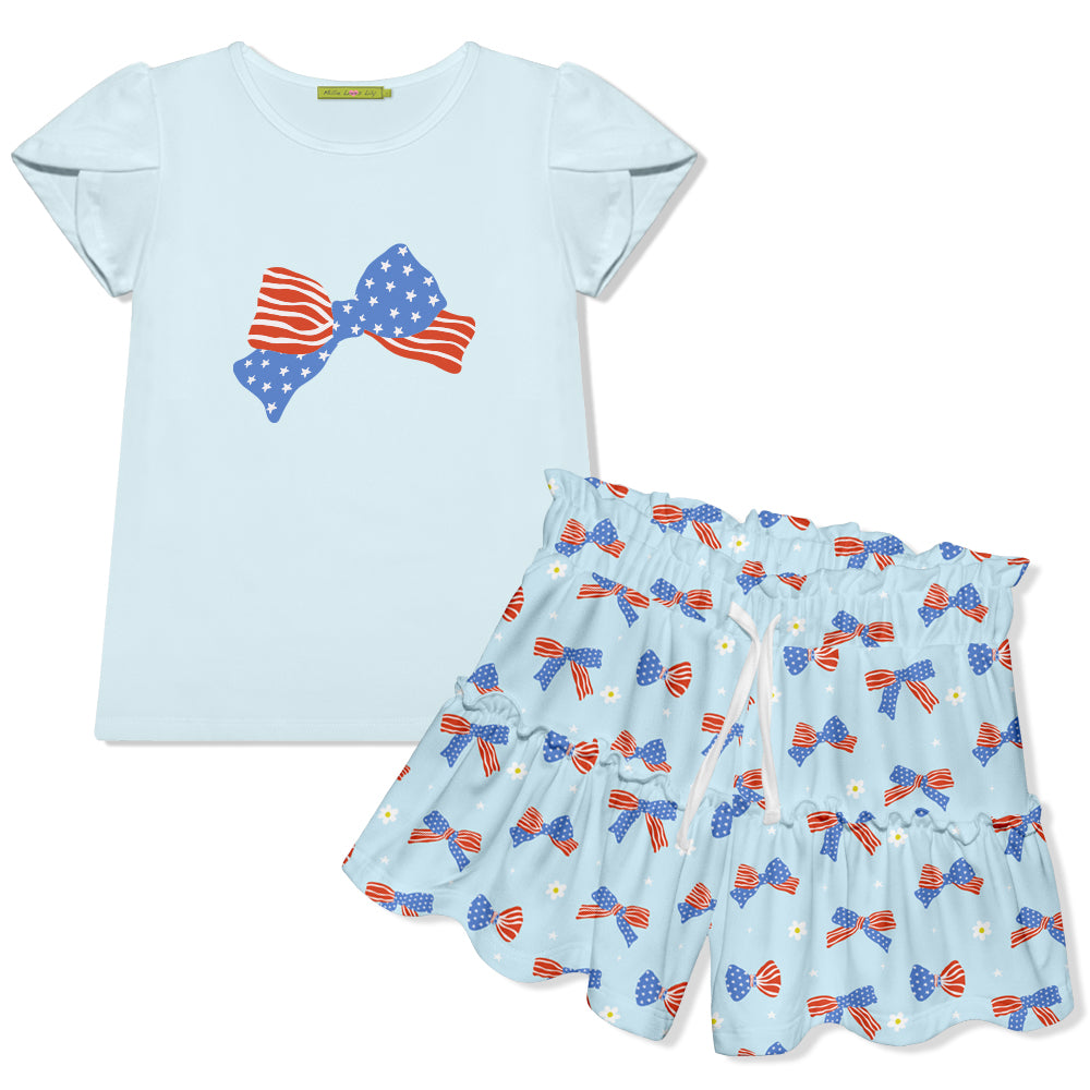 Kids Ice Blue Tulip-Sleeve Top & Americana Bows Split Skirt