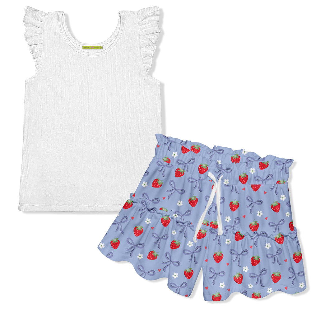 Kids White Ribbed Ruffle-Sleeve Top & Strawberries & Bows Short