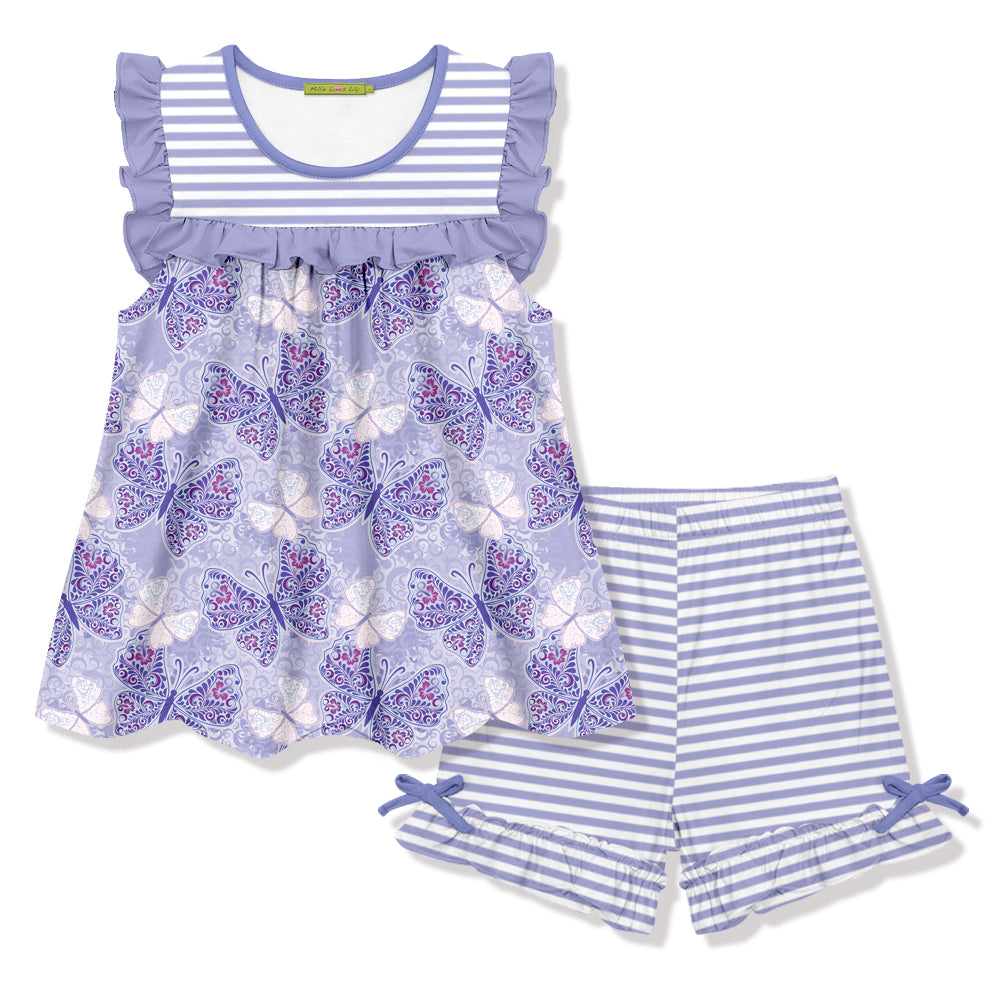 Millie Loves Lily Girls Orchid Butterfly Print Top and Stripe Short Set Big Girls,2-PCS