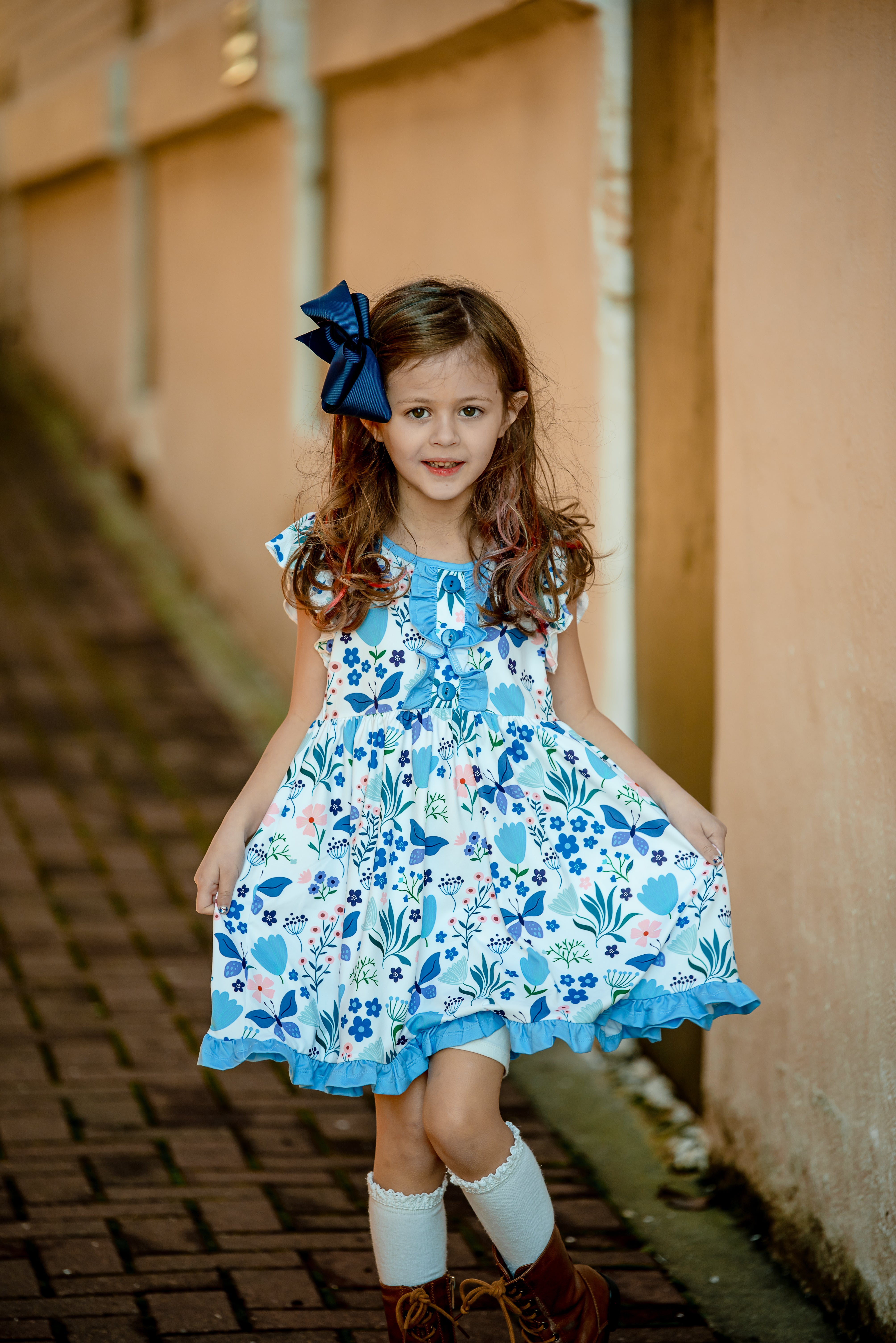 Kids Blue Floral Button-Front Angel-Sleeve Dress