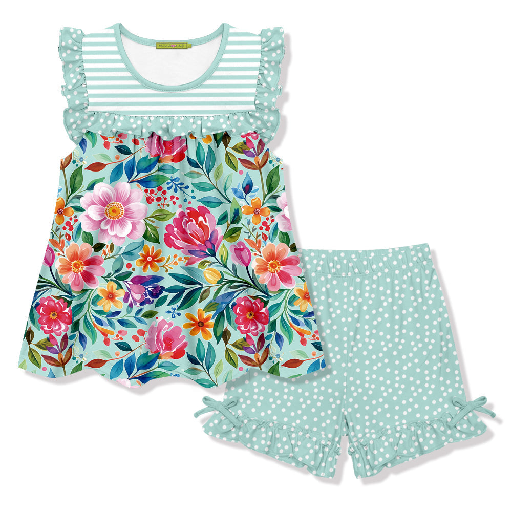 Kids Mint Becky Floral Ruffle Sleeveless Top & Pin Dot Bow Shorts