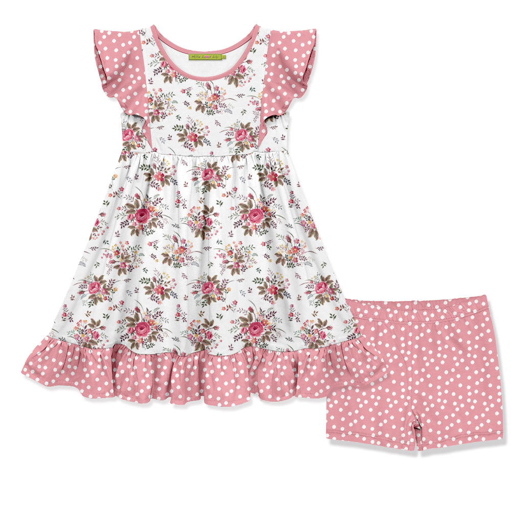 Kids Pink Floral Bouquet Angel-Sleeve Dress & Shorts