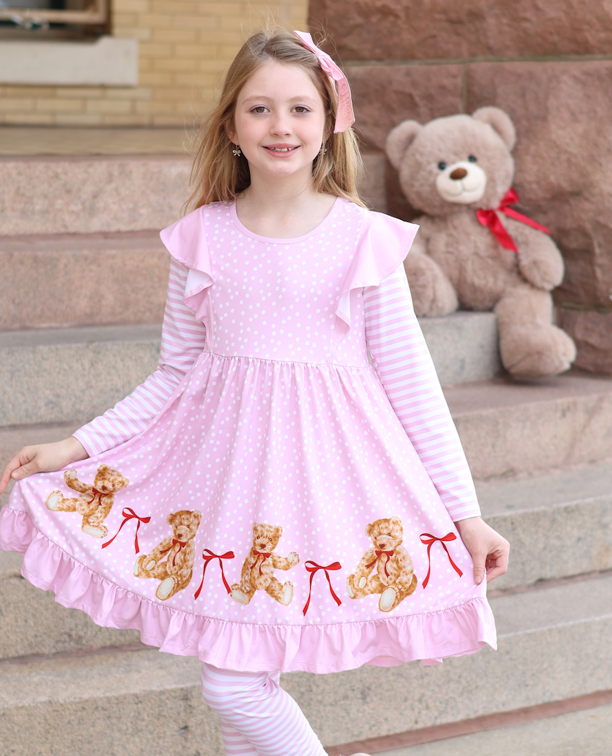 Kids Pink Teddy Bear & Bows Angel-Sleeve Dress & Stripe Leggings