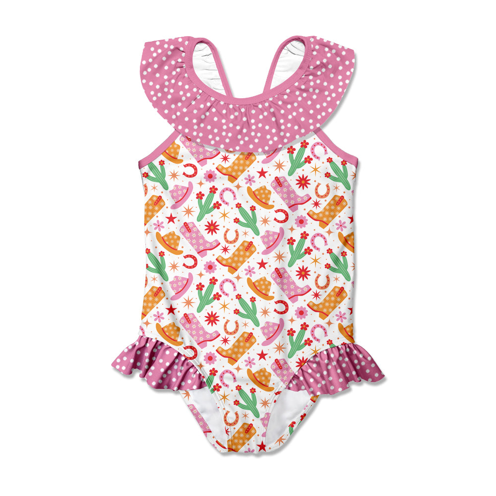 Kids Pink Western Style Bow Ruffle-Accent Yoke One-Piece