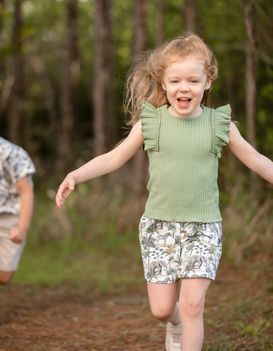 Loden Frost Ribbed Ruffle Sleeveless Top & Safari Scene Skort