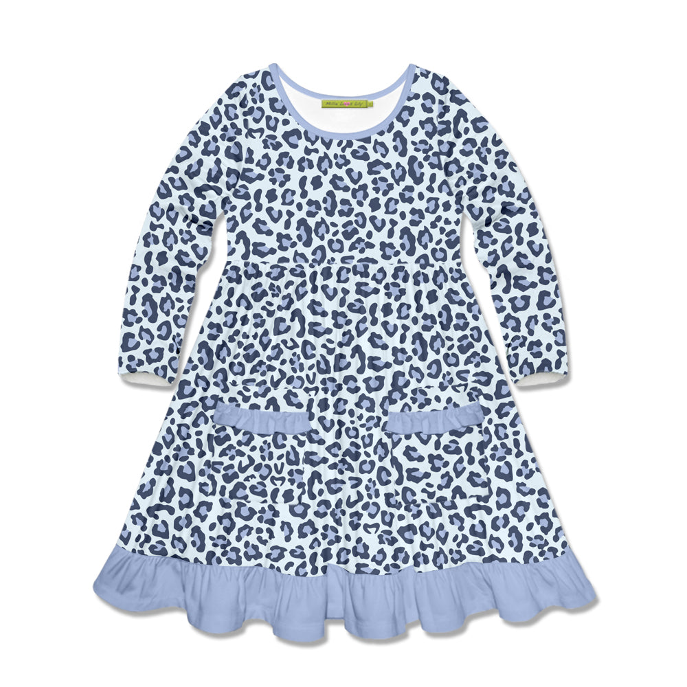 Kids Blue Skin Print Patch-Pocket Long-Sleeve A-Line Dress