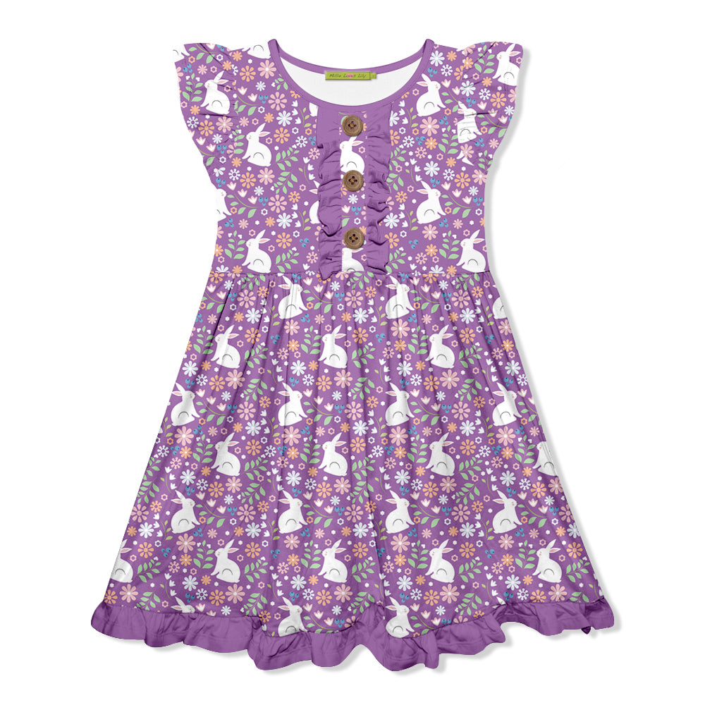 Kids Purple Spring Bunny Button-Front Angel-Sleeve Dress