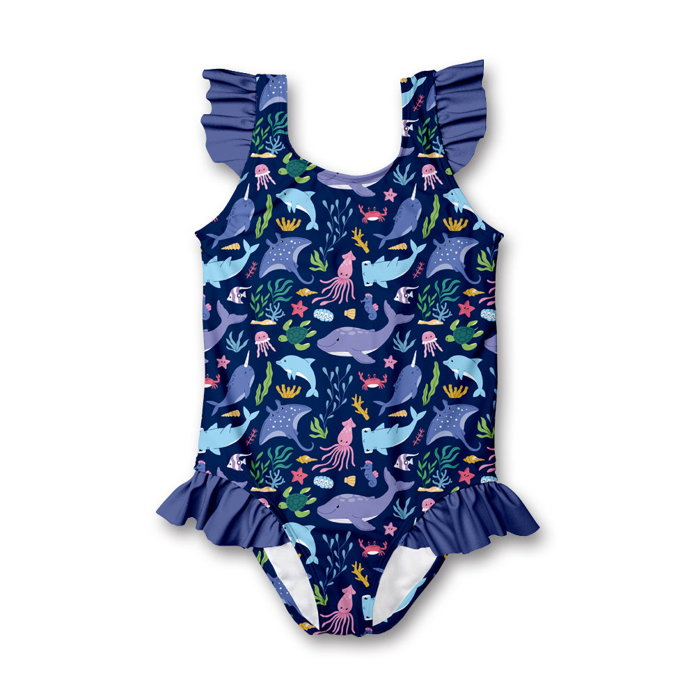 Kids Navy Sea World Ruffle-Accent One-Piece
